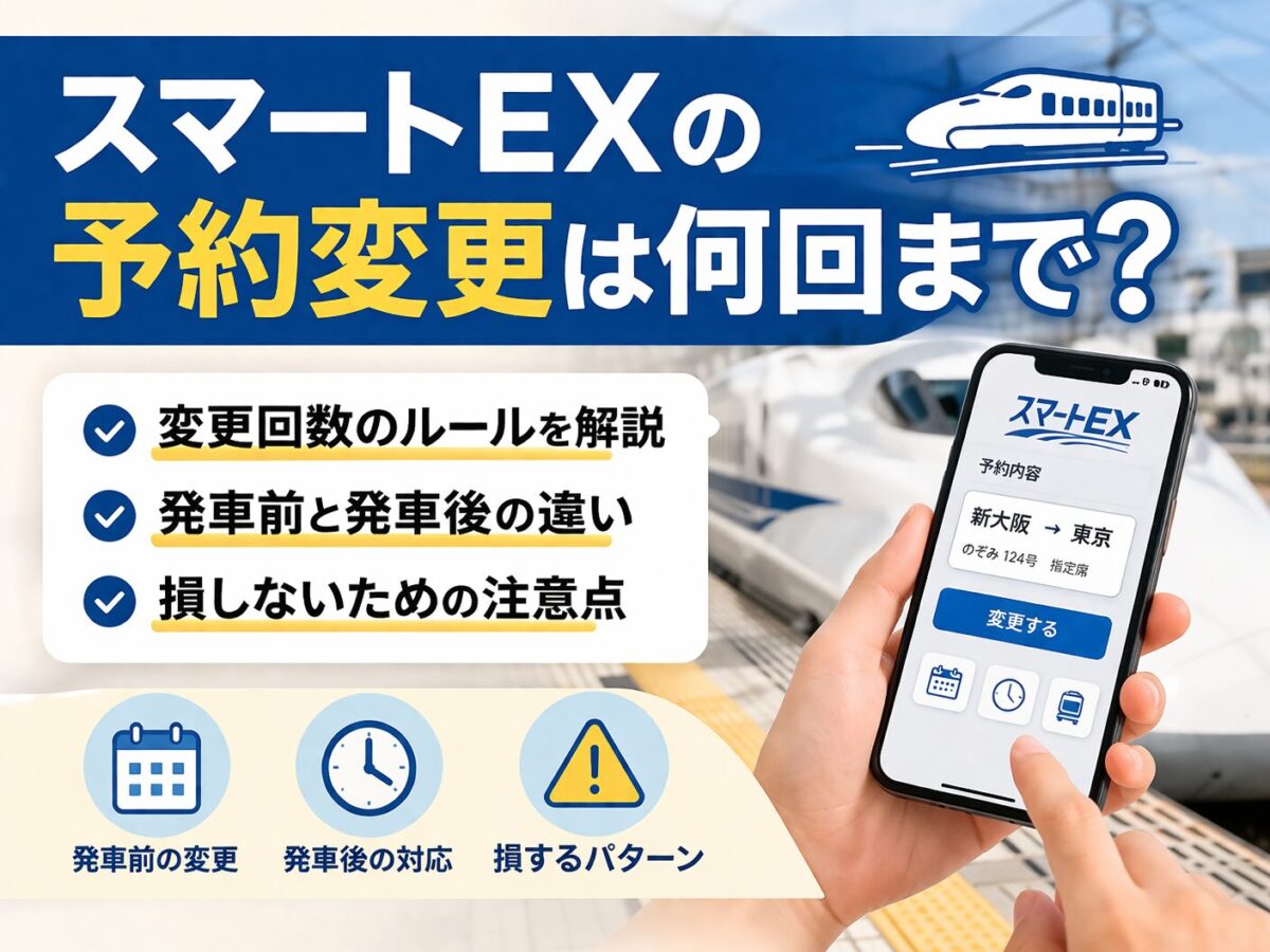 スマートEXで予約した新幹線は、WEBから簡単に変更できます。 では、予約変更は何回までできるのでしょうか。何度も変更すると制限はあるのか、手数料はかかるのか、不安になりますよね。 この記事では、スマートEXの予約変更回数のルールと、発車前・発車後の違いをわかりやすく整理します。 結論:変更回数に制限はある? スマートEXで予約した新幹線は、発車前であれば原則として回数制限なく変更できます。 何度変更してもペナルティはありません。ただし、早特商品など一部の割引商品では変更ができない場合... -